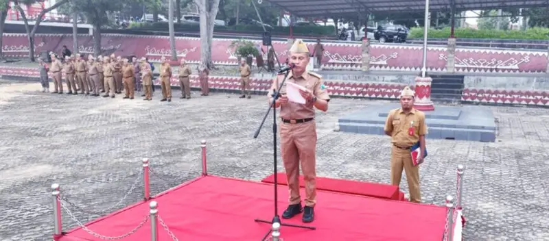 Sumaterapost.co – Pelaksana Tugas (Plt) Asisten Bidang Administrasi Umum (Adum) Sekretariat Daerah Kabupaten (Setdakab) Lampung Selatan Muhadi, memimpin apel mingguan di Lapangan Korpri, Pemda setempat, Senin, (5/2/2024).
