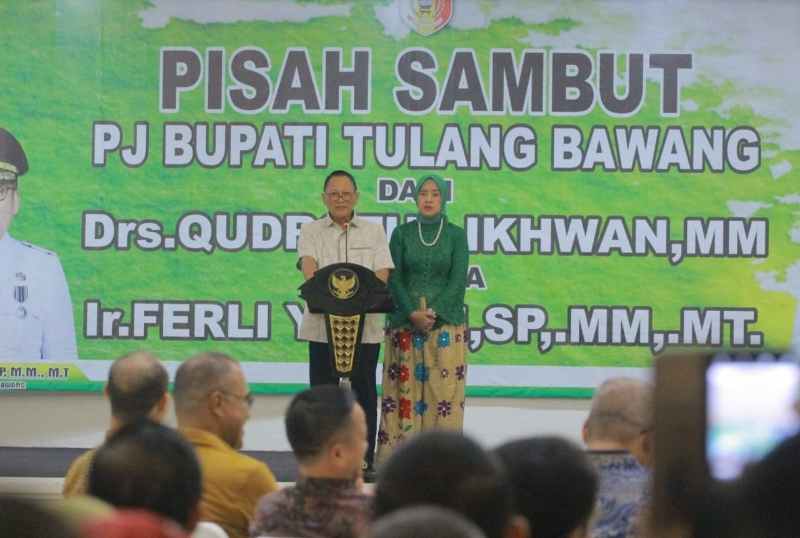 Dalam sambutannya, Pj. Bupati Tulang Bawang Ir. Ferli Yuledi SP., MM., MT., mewakili jajaran pemerintah daerah maupun segenap masyarakat Kabupaten Tulang Bawang mengucapkan terima kasih yang sebesar-besarnya atas prestasi, kerja keras, dan dedikasi yang selama ini telah ditunjukkan oleh bapak Drs. Qudrotul Ikhwan, MM., dan Ibu Herlinawati Qudrotul, S.H dalam membangun Kabupaten Tulang Bawang.