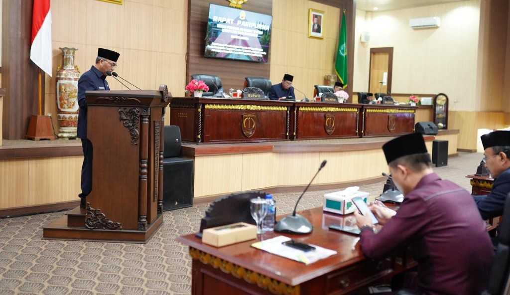 Muba – Pj Bupati Musi Banyuasin (Muba) H Apriyadi Mahmud menyampaikan tanggapan dan jawaban atas Pandangan Umum Fraksi-Fraksi DPRD Kabupaten Muba, terhadap Raperda APBD Perubahan Tahun Anggaran 2023 dalam Rapat Paripurna Masa Persidangan III.