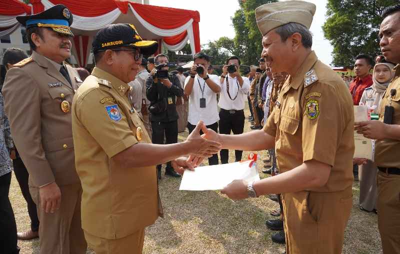 Penjabat Gubernur Lampung Samsudin didampingi oleh Kepala Kanwil ATR/Badan Pertanahan Nasional (BPN) Provinsi Lampung, Kalvyn Andar Sembiring dalam kesempatan tersebut juga melakukan penyerahan penganugerahan tanda kehormatan Satya Lencana Karya Satya 10, 20, 30 tahun dan melakukan pelepasan Purna Bakti Pegawai Kanwil Kementerian ATR/BPN Provinsi Lampung periode 2024 serta melakukan penyerahan sertipikat Hak Atas Tanah secara simbolis. (Dinas Kominfotik Provinsi Lampung).