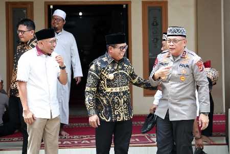 Sebelum melaksanakan silaturahmi, Pj. Gubernur Lampung Samsudin bersama Gubernur Lampung Terpilih Mirzani, Kapolda Lampung Irjen Pol Helmy Santika, Ketua DPRD Lampung Ahmad Giri Akbar melaksanakan shalat jum’at bersama di Masjid Polda Lampung.