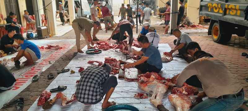 KEPOLISIAN Resort Kota Bandar Lampung dalam menyambut Hari Raya Idul Adha 1445 H melakukan penyembelihan 6 ekor sapi dan 2 ekor kambing qurban, Senin (17 juni 2024).