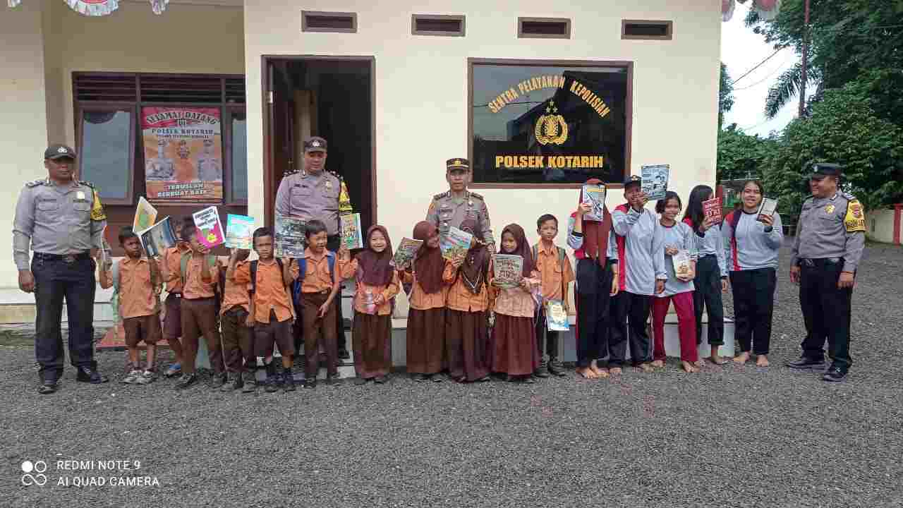 melakukan kegiatan pembagian buku baru dan bekas kepada pelajar SD dan SMP kecamatan Kotarih di halaman Kantor Polsek Kotari,Sabtu (2/9/2023).