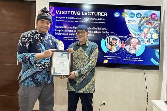 Unila : Prodi Magister Teknologi Pendidikan (MTP) FKIP Unila bersama Dosen Teknologi Informasi Universitas Muhammadiyah Yogyakarta (UMY) bidang keahlian digital education learning adakan visiting lecturer dan workshop.