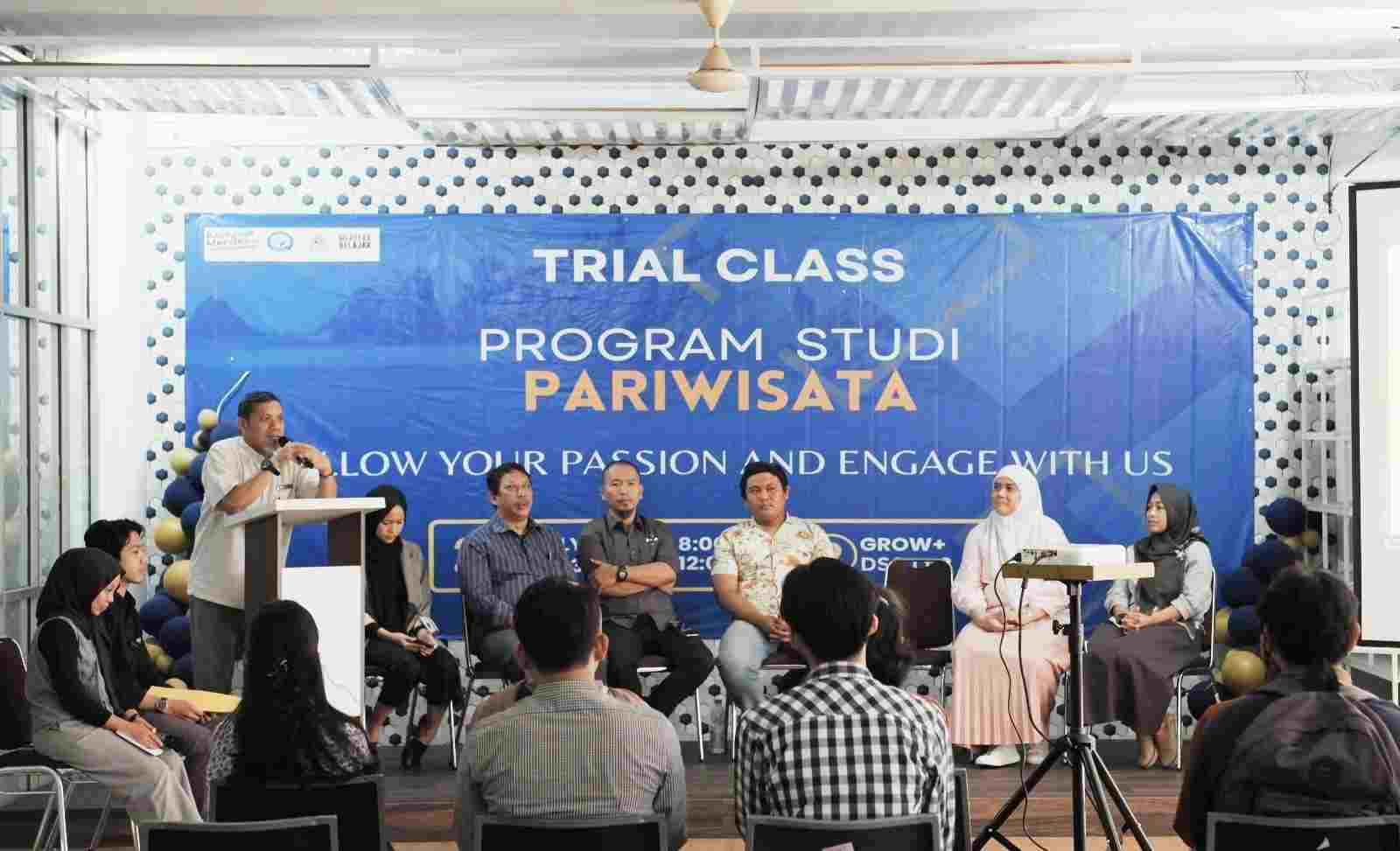 Trial Class menghadirkan narasumber Irpan Harianto, S.E, selaku agensi pariwisata Pantai Pahawang. Trial Class diikuti calon mahasiswa baru Prodi Pariwisata dan dihadiri Dekan Fakultas Desain, Hukum, dan Pariwisata (DHP) Dr. Handoyo Widi Nugroho, S.Kom., M.T.I. beserta tenaga pengajar lainnya.