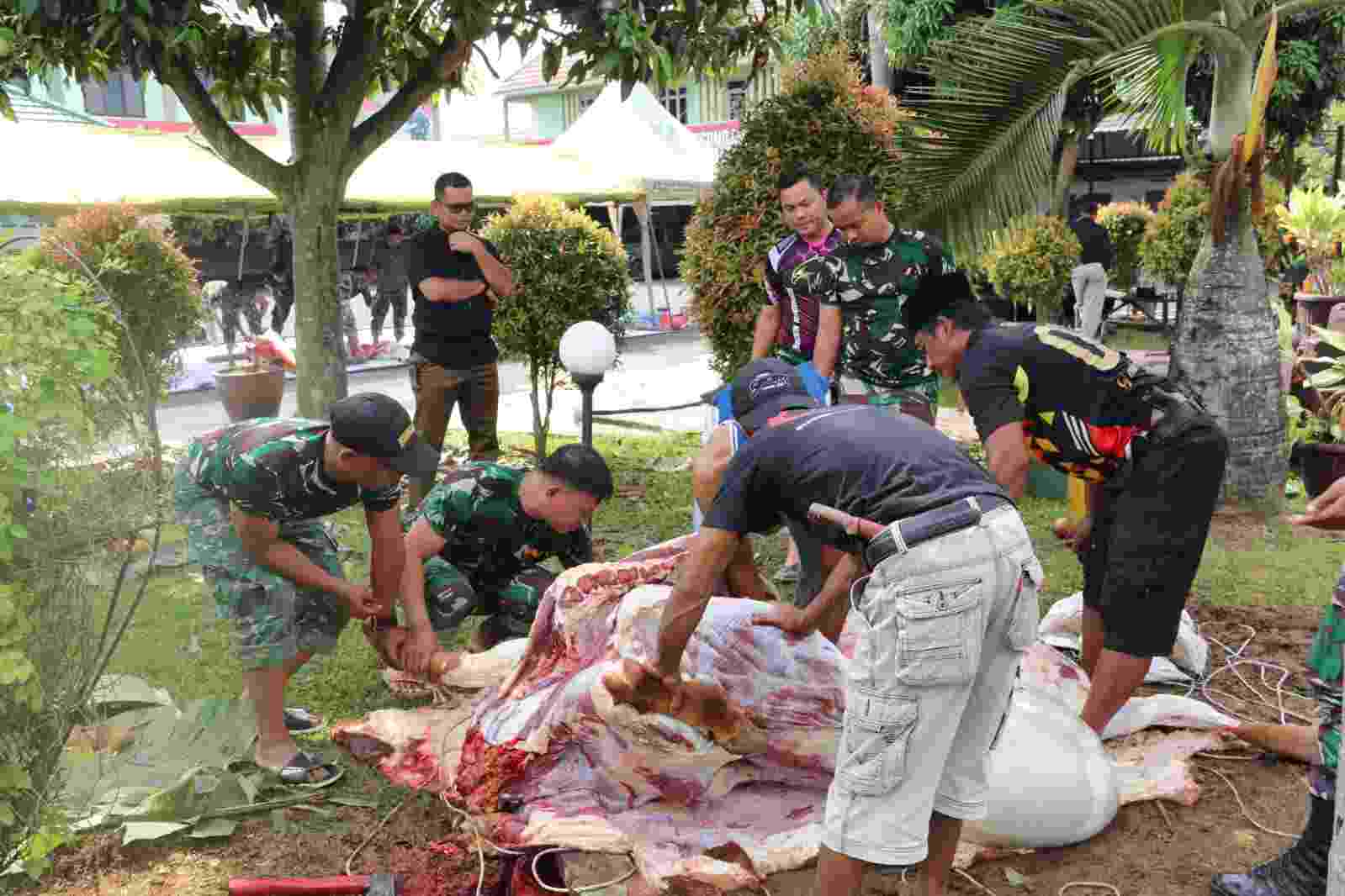 Usai pelaksanaan sholat Idul Adha, Dandim 0410/KBL didampingi Ketua Persit KCK Cab XXX Dim 0410/KBL Ny. Arum Tri Arto menyerahkan hewan (sapi) secara simbolis untuk di Qurban dan selanjutnya dibagikan kepada sesama di Markas Kodim 0410 Kota Bandar Lampung.
