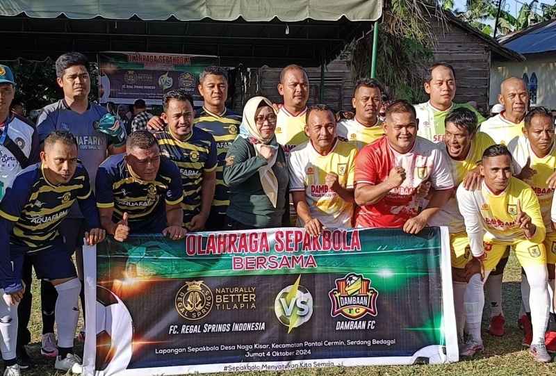 Sergai, SumateraPost.co | Regal Springs Indonesia (RSI), melalui PT Aqua Farm Nusantara, menunjukkan dukungannya terhadap olahraga dengan mengadakan pertandingan sepakbola bersama karyawan perusahaan dan tim Dambaan FC di Desa Naga Kisar, Kecamatan Pantai Cermin, Serdang Bedagai (Sergai), Jumat (4/10).