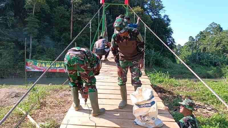 “Alhamdulillah, sampai hari ini progres pembangunan Jembatan Gantung Garuda sudah mencapai 74 persen. Saat ini pekerjaan difokuskan pada pemasangan lantai jembatan serta penguatan struktur utama agar jembatan nantinya aman dan layak digunakan masyarakat,” ujar Dandim.