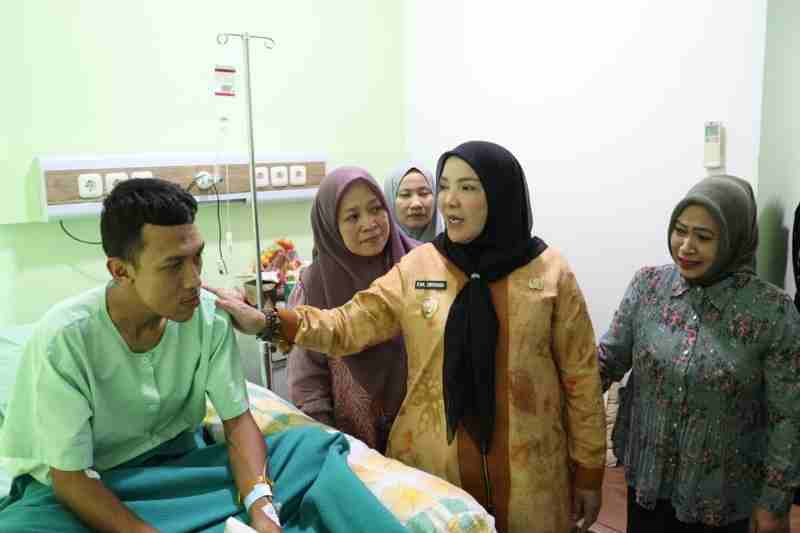 Bandar Lampung – Wali Kota Bandar Lampung Eva Dwiana menyambangi Aulia Ahmad Akbar pegawai Badan Penanggulangan Bencana Daerah (BPBD) Kota Bandar Lampung yang mengalami kecelakaan kerja saat menjalankan tugas evakuasi bencana di wilayah Gang Onta, Kecamatan Kedaton.