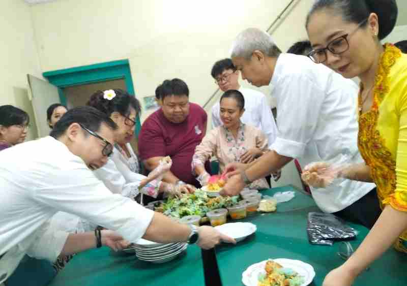 Setelah tercampur rata, nasi ulam itu kemudian disendok ke piring-piring dan dibagikan kepada para pengurus dan tamu yang telah menunggu.