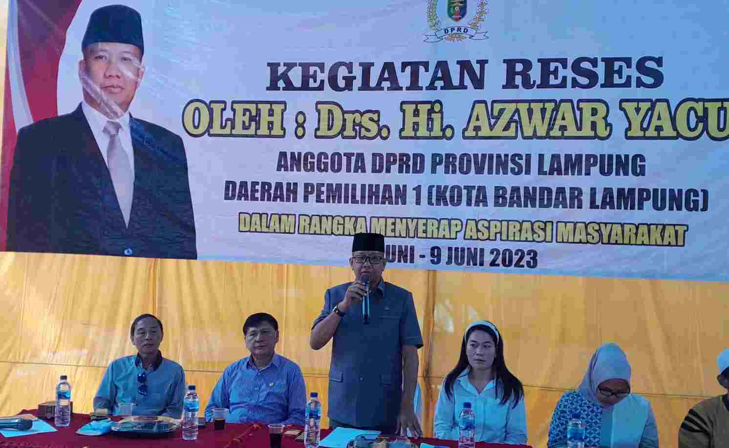 Dalam acara serap aspirasi (reses) pada hari Selasa ( 7 Juni 2023) dengan didampingi oleh ; Naomi Natalia, SH (Caleg DPR RI dari Lampung 1), Pratiwi Sarastika, SH.MH (Caleg DPRD Kota Bandar Lampung), Mawardi Shoubier, SH, Adriantoni Iksir (Tenaga Ahli DPRD Lampung), Fauzi RD Jayasempurna, S.Sos (tokoh masyarakat) serta Tim Sahabat Azwar Yacub, acara reses tersebut berlangsung sekira pukul 14.00 sampai dengan pukul 17.00 wib di Gedung Serba Guna Griya Abdi Negara.