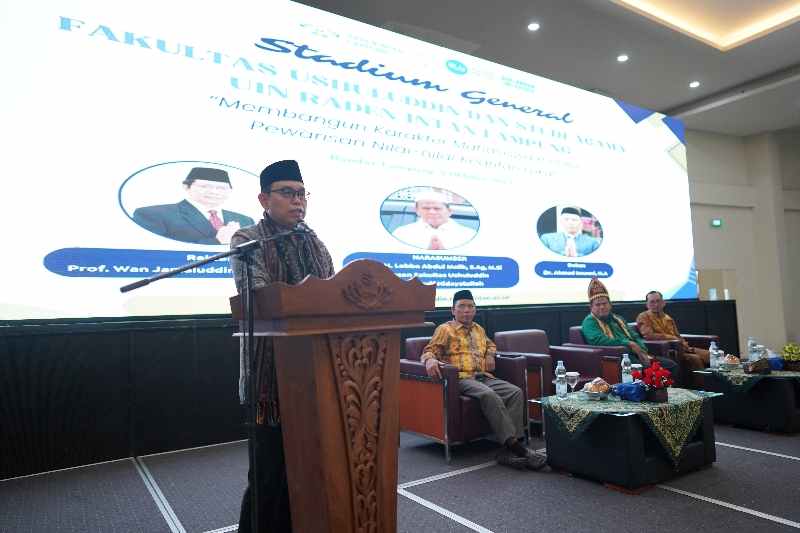 Bandar Lampung (SP) – Fakultas Ushuluddin dan Studi Agama (FUSA) Universitas Islam Negeri (UIN) Raden Intan Lampung (RIL) menggelar Stadium General bertajuk “Membangun Karakter Mahasiswa Melalui Pewarisan Nilai-Nilai Kearifan Lokal” pada Rabu (01/10/2024) di Ballroom UIN RIL.