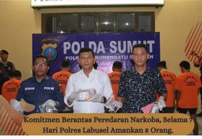 Kotapinang – Satuan Reserse Narkoba (Sat Resnarkoba) Polres Labusel dan Jajaran berhasil mengungkap 7 kasus Narkotika yang sekaligus juga mengamankan 8 orang tersangka, yang keseluruhan tersangka tersebut adalah laki – laki.