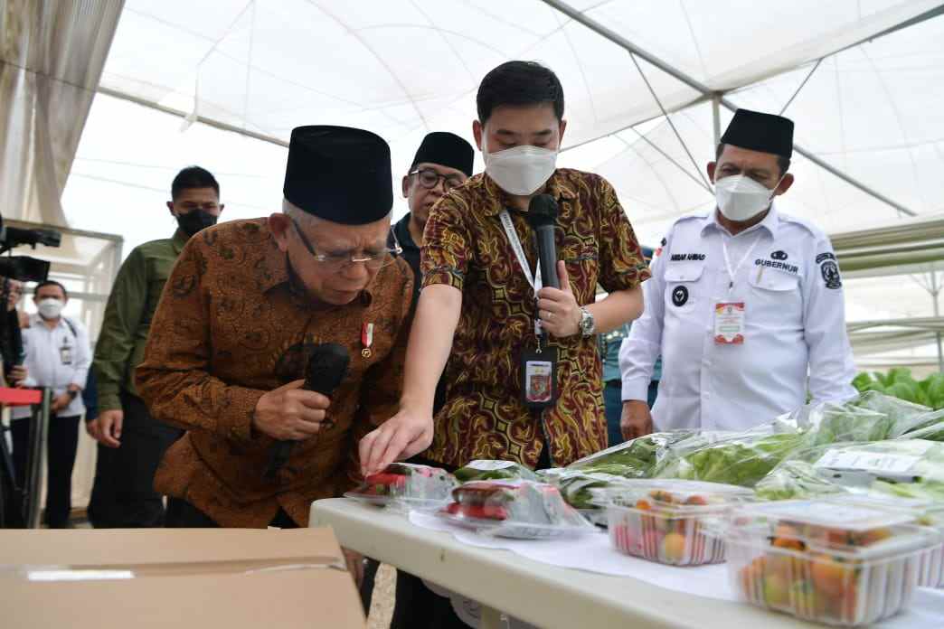 Pada kesempatan ini Wapres Ma’ruf Amin bersama Gubernur Ansar meninjau proses produksi sejumlah komoditas sayur hasil pertanian yang dikembangkan dengan sistem hidroponik modern sehingga menghasilkan produk sayuran berkualitas tinggi dan baik.